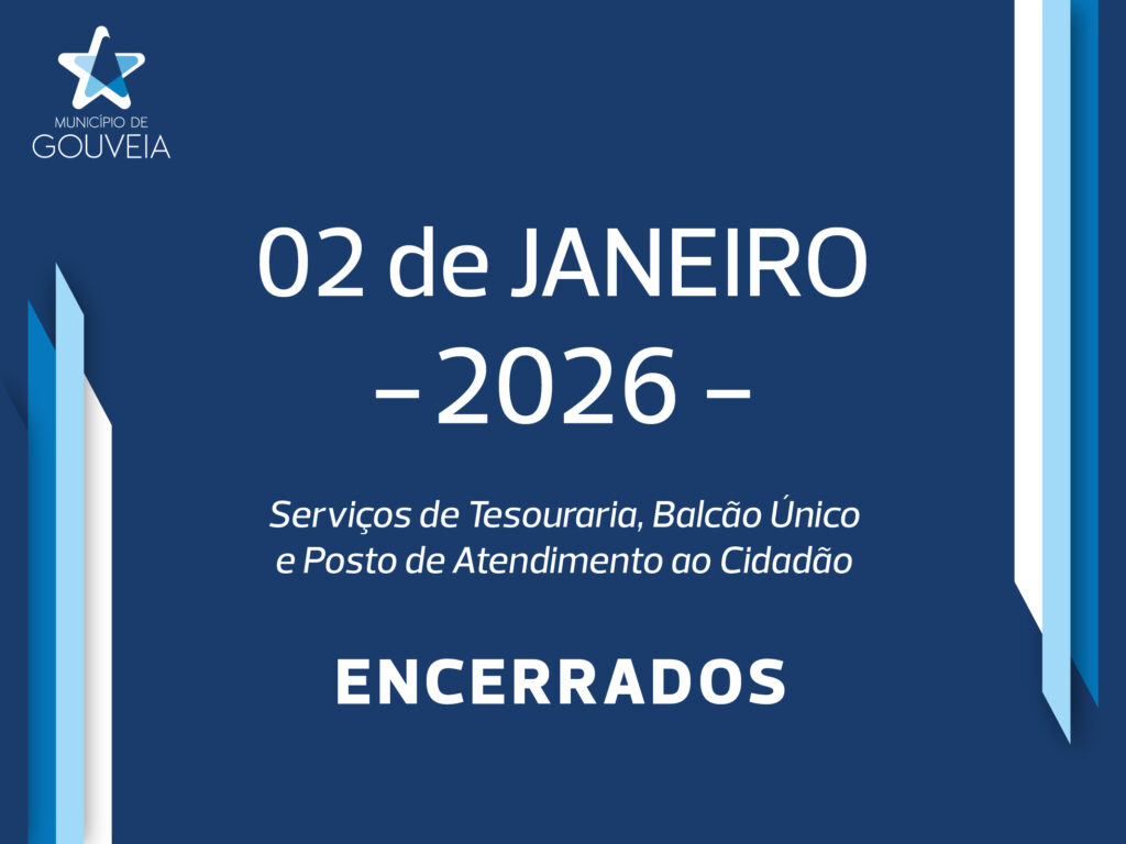 O Município de Gouveia informa que, no próximo dia 02 de janeiro de 2026 (sexta-feira), os Serviços de Tesouraria, Balcão Único e Posto de Atendimento ao Cidadão estarão encerrados ao público.