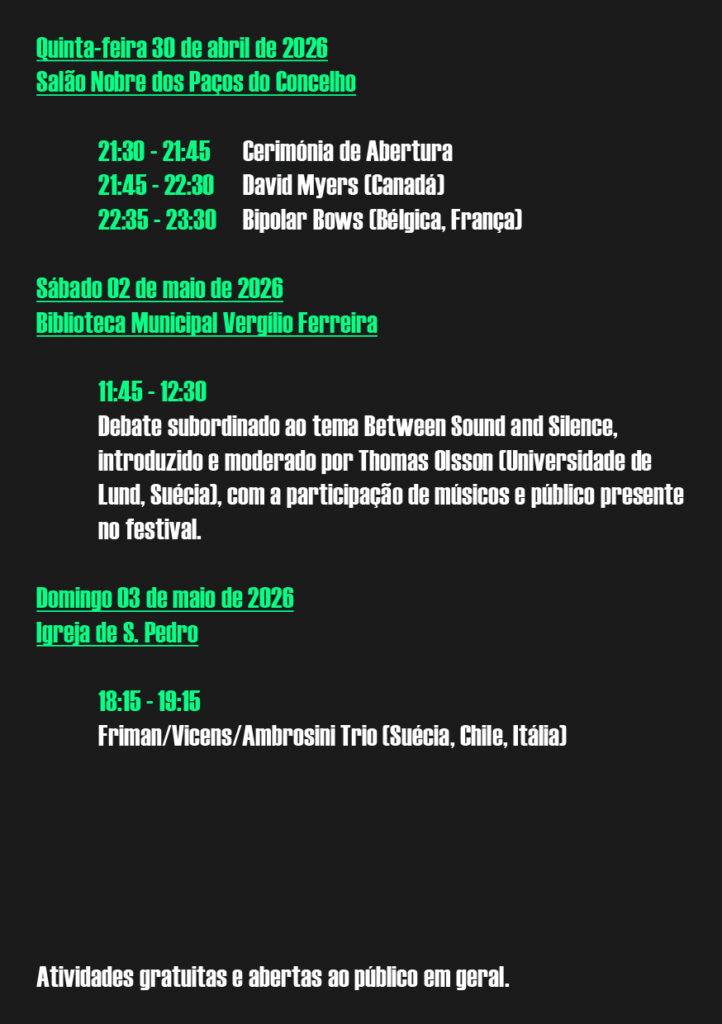 Na manhã de sábado, 2 de maio, a partir das 11h45, a Biblioteca Vergílio Ferreira será palco do debate sobre o tema “Between Sound and Silence”, introduzido e moderado por Thomas Olsson (Universidade de Lund, Suécia), com a participação de músicos e público presentes no festival.